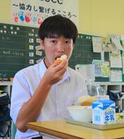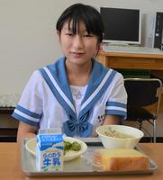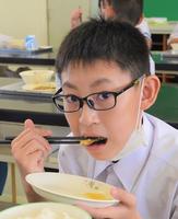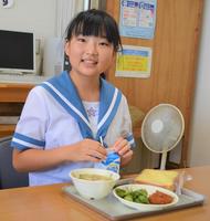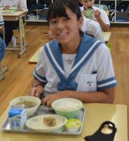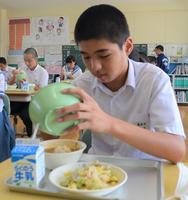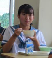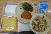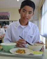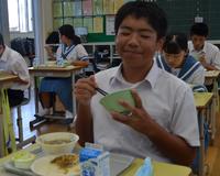 本日の献立は、麦ご飯、牛乳、もずくスープ、魚のカレー南蛮、味付けのりでした。本日は一年生を訪問しました。やっと中学校の給食の量にも慣れ、みんなしっかり食べています。大好きなメニューをおかわりするにはジャンケンに勝利する必要があります。さて、今日は誰が勝ったのでしょうか?