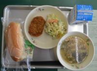 今日の献立は、コッペパン、牛乳、ワンタンスープ、くじらのメンチカツ、マカロニサラダ、マーガリンで、昭和30年から50年頃の学校給食の献立でした。この頃はごはんがなくて給食は毎日パンでした。よくコッペパンが出てきていました。今は、くじらの肉を食べることはほとんでありませんが、昔は肉といえばくじらでした。ワンタンもマカロニも小麦粉でてきており、当時の給食では、これらの小麦粉製品が良く献立に入っていました。とてもなつかし気持ちで職員は給食を食べましたが、生徒たちはどうだったでしょうか?