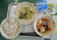 本日の献立は、麦ご飯、牛乳、おでん、レタスとひじきのサラダ、納豆でした。納豆は和水町の向上で作られた納豆です。和水町の子ども達は、丸美屋さんの協力を得て、小学生のときに、大豆や納豆、豆腐についての学習をしています。