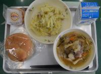 本日の献立は、ひのくにパン、牛乳、タイピーエン、ジャーマンポテト、焼きプリンタルトでした。ジャーマンポテトのじゃがいもは、一度ゆでてから炒めます。