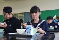 本日の献立は、麦ご飯、牛乳、節そうめん、豚角切り肉の煮物でした。お隣南関町は、そうめんの名産地です。節そうめんは、手延べそうめんをつるして干した後、直線の部分を切り落とすと性器男商品の手延べ麺になり、残った部分が節麺になります。形は、アルファベットのUの字のように曲がっています。お店で売られていることは少ないですが、手延べ製麺業が盛んな地域では、袋に入れて売られています。