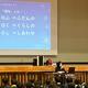 全体会では高橋校長・二殿教育長の挨拶に続き、研究概要を研究主任・水口教諭が参加者全員に説明しました。