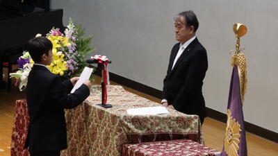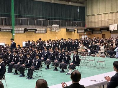校長先生の式辞があり、「先輩」となる生徒の皆さんへの期待を込めたメッセージと、『過去は変えられない。変えられるのは今と未来。今日の出逢いを大切にして、今日から未来を変えていこう』といったお話がありました。