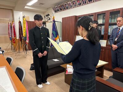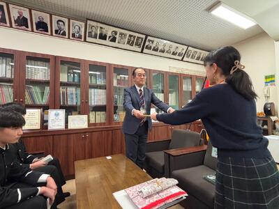 そして本日、JICA熊本デスクの方が来校され、原田さんと松永さんに直接表彰していただきました。合わせて学校賞も表彰していただきました。