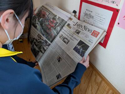 先日の全日本中学校英語弁論大会において、3年生・工藤さんの活躍によりThe Japan Times(英字新聞)が3か月分贈呈されました。英字新聞が置かれたコーナーにはたくさんの生徒が集まって、手に取って読んでいる光景が見られました。これからもぜひ手に取って、英語の記事に触れてみてください。