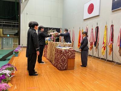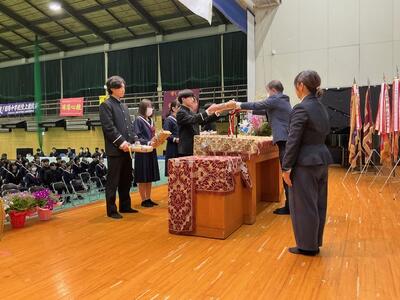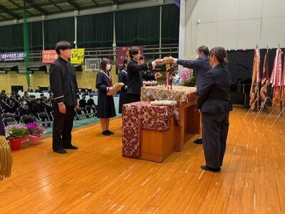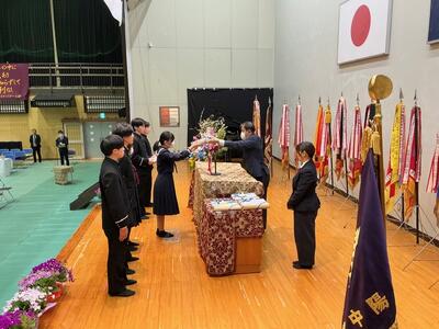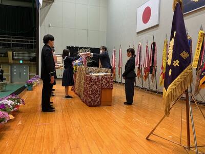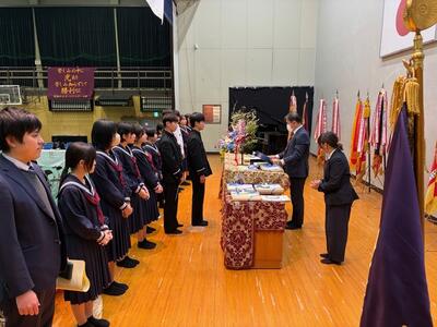 表彰の後、修了式を行いました。明日の卒業式を前に、3年生1年間の教育課程の修了証と通知表を各クラス代表に手渡ししました。代表で受け取った生徒の表情からは、やり遂げた達成感と安堵感を感じたところです。