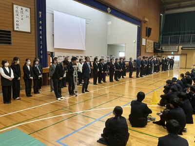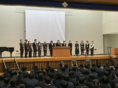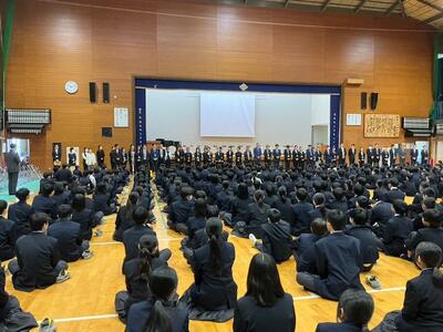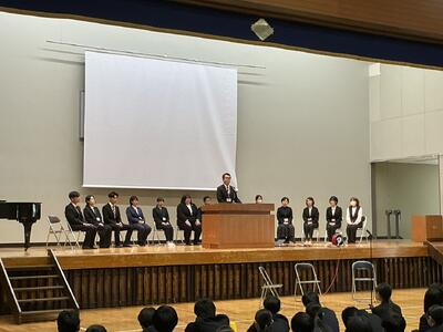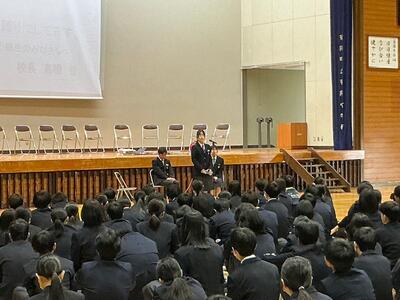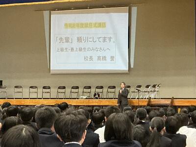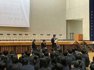 始業式の最初には、3名の生徒が新年度にかける思いを意見発表しました。どの生徒からも、先輩や最上級生としての心構えや夢拓くために今一度、自分自身の生活を見つめていきたいといった意気込みが聞かれました。