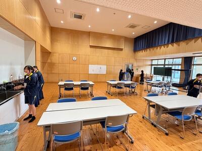 2年生は主に体育館内の準備。整然と椅子を並べたり、3年生が体育大会時に制作したパネルを掲示したりしました。