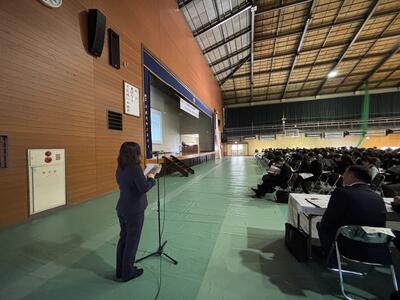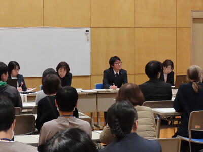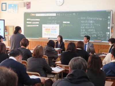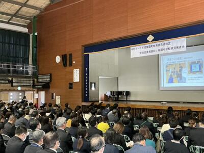 全体会では高橋校長・二殿教育長の挨拶に続き、研究概要を研究主任・水口教諭が参加者全員に説明しました。
