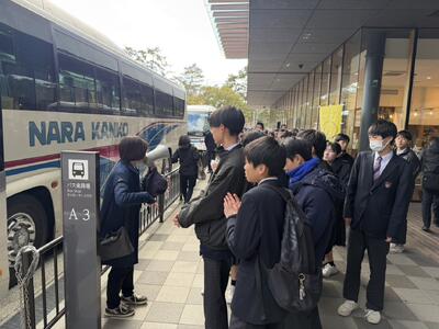 新幹線は定刻通り博多駅に到着し、一行はバスに乗り換えて一路菊陽中学校を目指します。