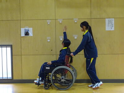 「車いす体験」…前半は講話をいただき、後半は実際に体育館や校内を2人1組で車いすに乗って回りました。スロープや段差での通行を経験し、大変さを感じました。また、自動販売機のモデルを使って購入体験をしました。ボタンに届かずに苦労していました。UD化の必要性を体感したようです。