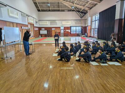 本日の5.6校時、R8年度入学予定の新入生(現6年生)とその保護者の方々が本校体育館に集まり、新入生説明会を行いました。
