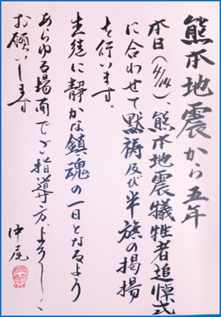 本校では、熊本地震の教訓を大切にし、命と暮らしを守る知識や態度を育むため、本日午後、「避難訓練」を実施します。訓練の冒頭、熊本地震のお亡くなりになった皆様へ黙祷を捧げ哀悼の意を表すとともに、合わせてコロナ禍における新たな行動様式について意識を新たにする講話などの取組を行います。(文・写真:中尾)