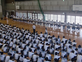 4月24日に、体育大会の結団式を行いました。今年度のスローガン「百花繚乱~最高のクライマックス~」が発表されました。また、7つの団の編成クラスも発表されました。5月20日(日)の本番に向けて、頑張っていきましょう。