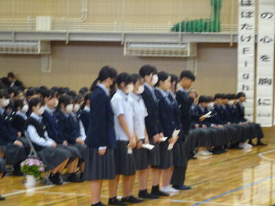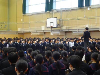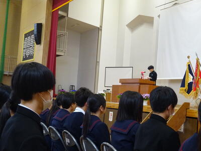 3校時は「全ての人の心に残る卒業式を実現するための全校集会」です。1年からは3年生へのメッセージ、2年生は3年生へ合唱のプレゼントを贈っていました。3年生は卒業式の歌を下級生に披露してくれました。