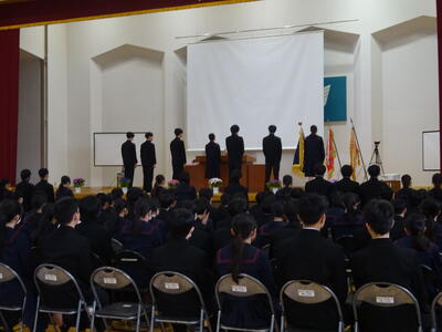 まずは修了式です。生徒作文発表のあと、各クラスの代表が堤校長より修了証をいただきました。