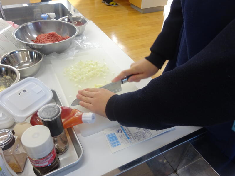 2年生は家庭科で調理実習を行っています。つくっているのはハンバーグです。良い匂いが廊下にも漂っていました。中には危なっかしい人もいますが、楽しそうに頑張っていました。