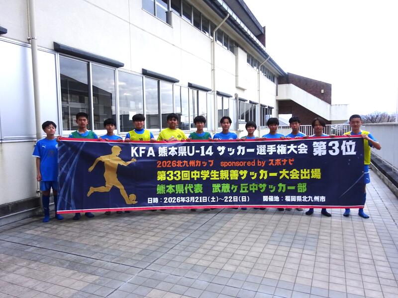 熊本県U-14サッカー選手権大会で3位となり、今度北九州で行われる九州大会に出場が決定しました。応援の横断幕が完成したので、披露してくれました。本番は3月21日、22日です。ぜひ頑張ってください。