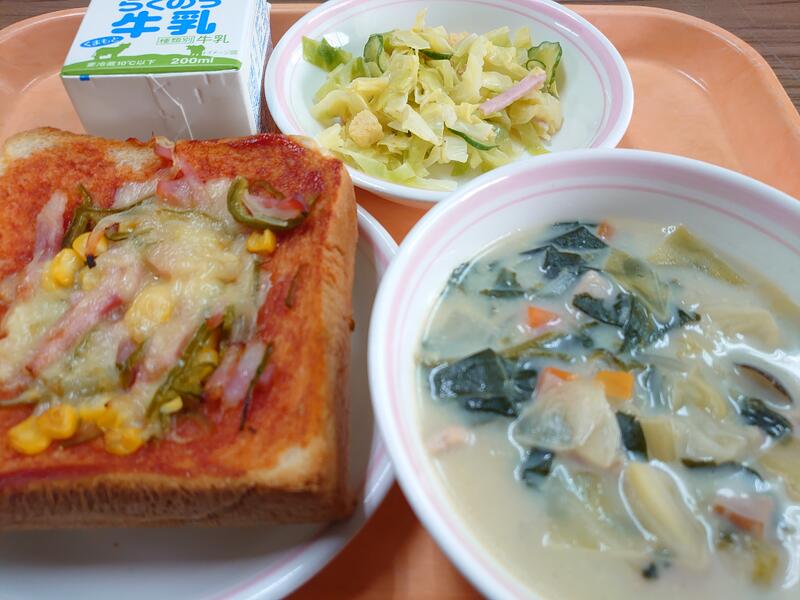 ◎3月献立.pdf ◎3月給食だより.pdf ◎3月ふるさとくまサンデー.pdf 【本日の献立】(今年度最後の給食) 牛乳、ピザトースト、 豆乳スープ、シーザーサラダ 【次回の献立】(令和8年度は、4月8日~)