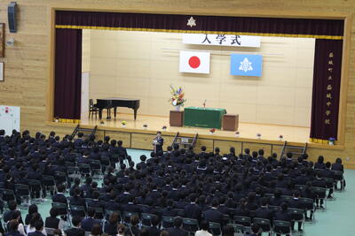 新しい制服に身を包み、吹奏楽部のBGMの中、緊張の面持ちで入場してきた1年生。担任の先生の氏名点呼にも元気な返事で応えていました。