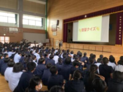 また、美化委員会からの発表がありました。なぜ、無言掃除をするのか…無言掃除から得られる8つのメリットと5つの心についての話の後、全員参加型のクイズを行いました。