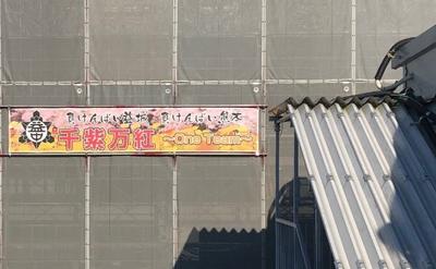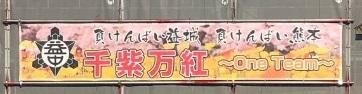 1年生教室棟の向かい側の工事フェンスに「負けんばい益城 負けんばい熊本 千紫万紅~One Team~」の横断幕が掲げられているのです。