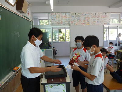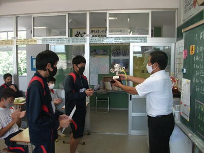 基礎学力アップテスト(英語)クラスマッチの表彰を行いました。事前に公表した単語からの出題ですので努力すれば高得点が望めるテストです。モチベーションを高めるためにも、クラスマッチ形式で取り組んでいます。今回から平均点だけでなく、クラスの満点率のポイントとの合算で判定します。たとえその教科が苦手な友だちがいて平均点が低くなったとしても、満点率で十分逆転可能なシステムです。それぞれに応じた努力で、クラスに貢献できるような仕組みにしました。今回は3年A組が優勝でした。今回から、2位3位のクラスにもトロフィーを授与します。月曜日には基礎学力テスト(国語)があります。健闘を期待します。