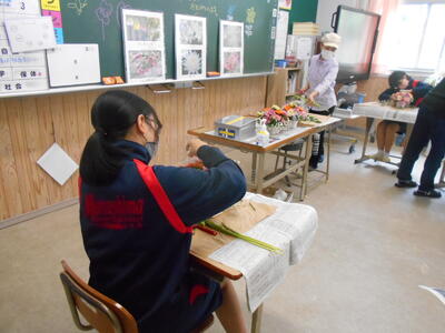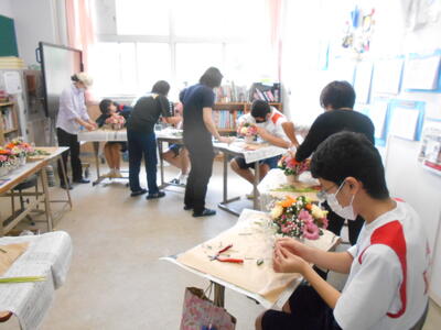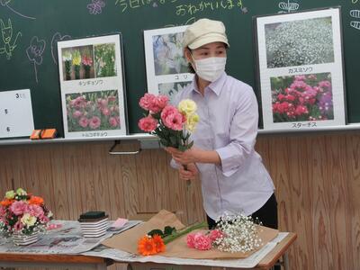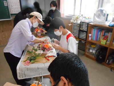 なのはな学級、すくすく学級、あおぞら学級合同の自立活動の取組として花育体験教室を実施しました。これは上天草市農林水産課の事業として、花の素晴らしさに触れ、造形することで創造する力を高めることを目的にしています。上天草産の花を中心に使用し、全国有数の花の生産地である上天草市への郷土愛も高めることも狙っています。当日は市内の花農家竹中様や松島町の「フローリストモリ」の森様にもおいでいただき、フラワーアレンジメントの指導をしていただきました。