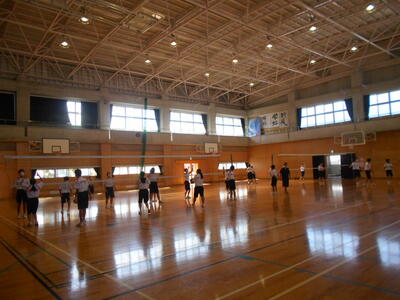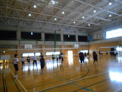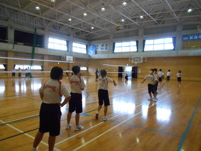 バレーボールで、ネットを挟んでジャンプトスやパスの練習をしていました。