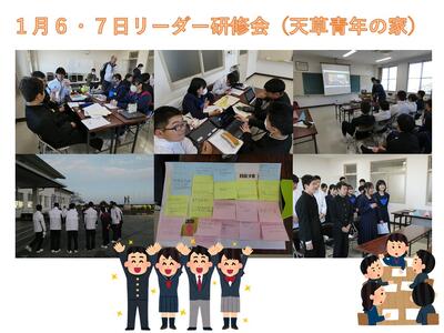 1月6日・7日に1泊2日の日程で、新生徒会執行部15名によるリーダー研修会を天草青年の家で行いました。生徒会活動の意義・リーダーとはどうあるべきか、松島中の目指す姿についてなど、今後の松島中学校を発展させるために、グループ協議等を行いました。2日目には、台湾のゴンリャオ中学校とオンラインで交流を行いました。