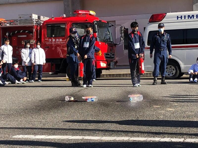 12月23日(月)に火災避難訓練を行いました。今回の火災避難訓練は消防士の方に来ていただき、消火器による消火体験や煙霧体験もしました。