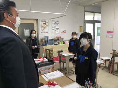 放送による「退任式」の後、職員室で代表生徒による「感謝状渡し」が行われました。