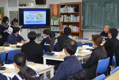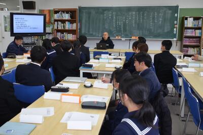 1月30日 学校保健委員会を開きました。今回の学校保健委員会には、株式会社ムーンムーン代表竹田浩一様に「睡眠について」のご講話をしていただきました。そして、学校薬剤師の狩野様をはじめ、山鹿市役所の保健師やPTA役員の皆さまにもご参加いただき、生徒の代表とともに睡眠の改善のためにできることを協議しました。