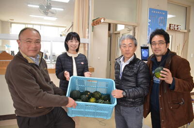 11月17日 三玉にあります立山農産の 立山 和宏 様(山鹿市教育委員)から、学校給食用に南瓜をいただきました。収穫後の保存状態が良い南瓜は色つやも良く、見るからに甘くて美味しそうです。大きさも揃っていますので、調理にも好都合のようです。