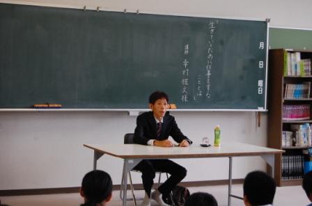8月31日(金)に、2年生を対象に職業講話を行いました。自衛隊での入隊経験や、幸村輪業を経営しつつ、コンビニエンスストアを開業された幸村雅文様よりご講話いただきました。職場体験学習だけでなく、生きる上で大切な「コミュニケーション力」、「交渉力」、「状況把握力」、「機転を利かせる力」について教えていただきました。これからの学習や自分の生き方に生かしていきましょう。講話していただきました幸村様ありがとうございました。