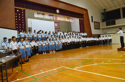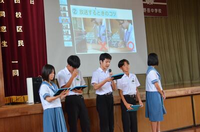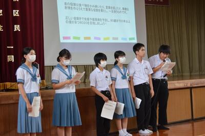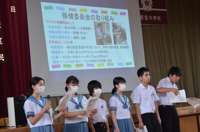 生活委員は、日頃の活動報告と2学期の生活を健康で安全に送ることがことができるように、熱中症やけがの予防、感染症予防対策、そして、歯と口の健康についてわかりやすく説明していました。