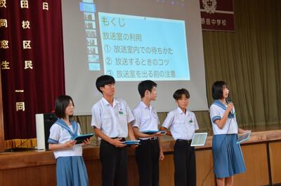 放送文化委員は、放送室の利用の仕方や放送の仕方について、動画や掲示物も交えてとても丁寧に説明していました。