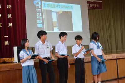 9月10日 今日の米野中タイムは生徒集会でした。集会では、保健委員会と文化放送委員会が、学校生活をより良く過ごすことができるように、スライドや動画を使って提案やお願いをしました。