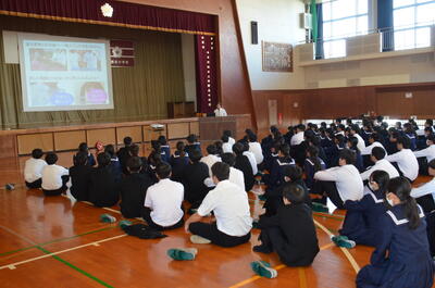 11月14日 薬物乱用防止教室を5校時に開きました。今年度も学校薬剤師 狩野壮太郎 様に講師をつとめていただきました。講話では、薬剤師の仕事をはじめ薬の飲み方や危険薬物の種類、そして、人体への被害、脳への影響等々たくさんの話題をあげながら、なぜ一度でも薬物を使ってはいけないのかを分かりやすく説明していただきました。