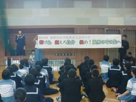 5月10日の午後に体育大会の結団式を行いました。始めに生徒会から、今年の体育大会テーマ「繋げ心 超えろ自分 挑め!限界のその先へ」が発表されました。生徒会の皆さんが、クラスから出た意見をまとめて練り上げてくれました。