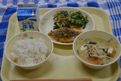 「本日の献立」は、日頃から提供している「麦ごはん・魚のにんにくソースかけ・厚揚げのみそ汁・ほうれん草のごま和え・牛乳」でした。器に盛られたメニューは、見た目にのいろどりが美しく、どのごちそうも口に含むとふかふか、ほくほく、しゃきしゃきしており、調理の先生方の日頃の技が今日もさえていて、大変結構なお味でした。ごちそうさまでした。そして、ありがとうございました。