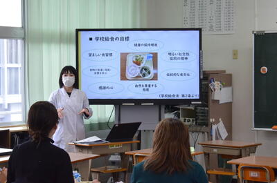 試食会では、会食をしながら、栄養教諭が安心・安全な給食を提供するための調理の工夫や作業工程の注意点を示したり、食育としての給食の価値を説明したりしました。また、給食の食材は地産地消の実践をしていることや残滓が少ないことなど、給食に関するさまざまな情報提供を保護者の方々にお伝えすることができました。