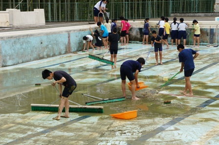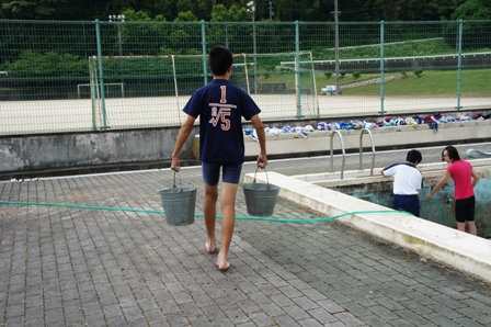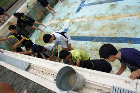 今年度のプール掃除が6月17日に行われました。生徒達は水の中にいたカエルなどにあわてながらも、一生懸命掃除をしていました。途中おしりからこける生徒もいて、大騒ぎでした。しかし、自分達が使うプール、汚くて困るのは自分達です。バケツで水を運ぶ人、真ん中で集めたゴミを捨てる人、壁を磨く人と、自然に役割分担をして効率よく掃除をしていました。お陰できれいになったプールでの授業が待ち遠しいです。