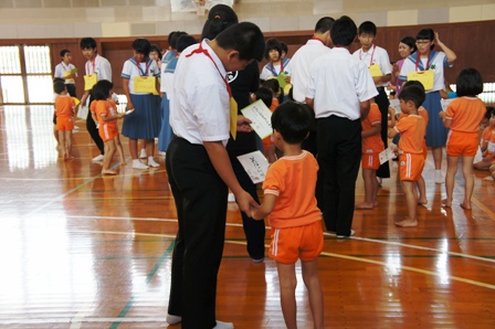 6月13日、昼休みに校区内3つの保育園から園児を招き、本校3年生との交流を行いました。この行事は一昨年から行っており、保育園の先生方に毎回引率していただいています。