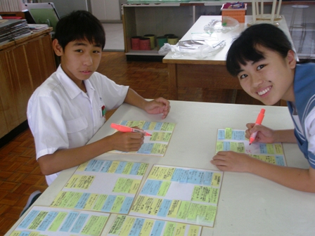 交流は昼休みの時間を使って行われました。かわいい園児達の姿に生徒たちもそわそわ。まず最初に園児と中学生のペアを作りました。園児も生徒も、始めはお互いに少し緊張した様子でしたが、名刺を交換して「好きな食べ物は?」「好きな動物は?」と会話を交わすとしだいに打ち解けてニコニコ笑顔を交わしていました。