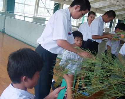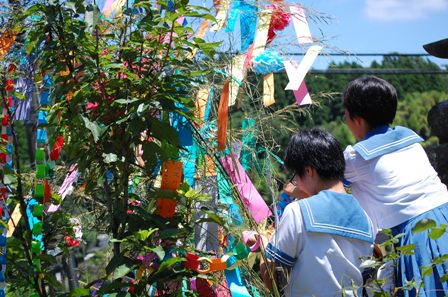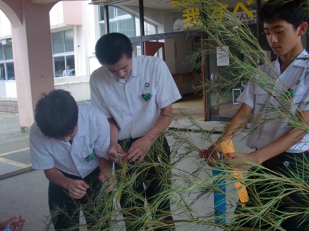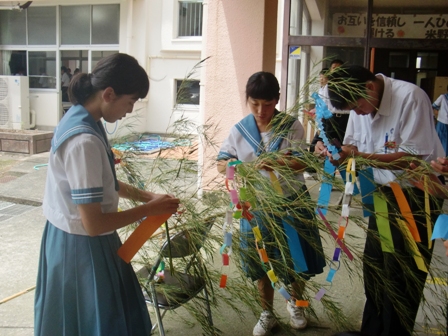 本日は、七夕神社に奉納する笹の飾り付けを行いました。生徒一人一人が願い事を書いた短冊を笹につけていきました。3年生は受験を控えているためか、受験についての願い事が多かったようです。熊本の復興を願うものも多く見られました。笹を頂いた西村さんに感謝いたします。