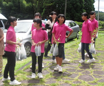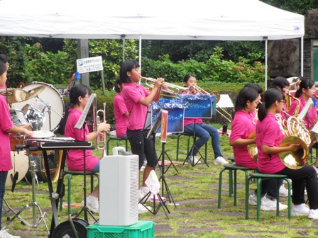 鹿央物産館で開催されている「鹿央里やま蓮まつり」に、7月9日(土)本校の吹奏楽部が参加して演奏を披露しました。天気が心配されていましたが、雲り空の下演奏が始まると日も差し始めました。昨年からこの蓮まつりの中で演奏させていただいてご好評頂いており、今年も楽しんで頂けたことと思います。演奏後は学校で育てた花苗を配りました。