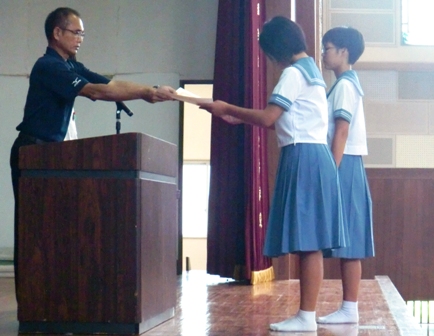 本日は、全校集会で、雨で延期となっていたソフトテニスの表彰と、県中体連総合体育大会に出場する生徒の選手推戴式がありました。ソフトテニスでは、個人3位という好成績を収めました。