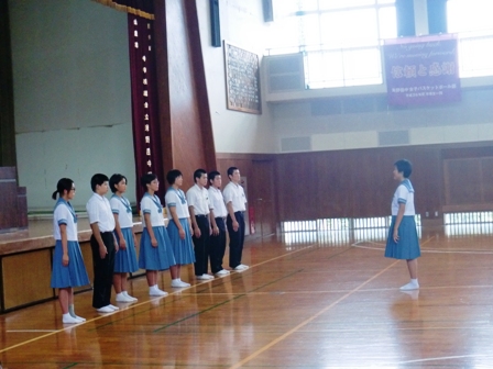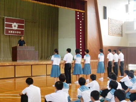 県の代表選手は、校長先生から激励の言葉を頂くと、一人ずつ抱負を述べました。全員気合いの入った様子で、米野岳中の代表として全力で臨んでくれることと思います。試合の勝ち負けだけではなく、試合中の態度や心持ちでも相手に勝つ気持ちでいきましょう。