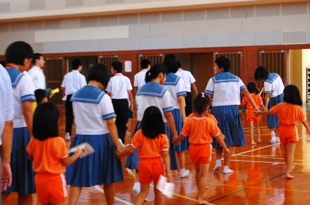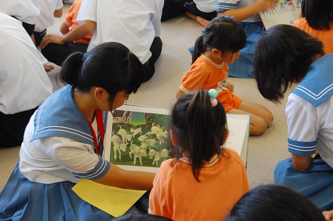 本日は、米田保育園・山鹿西保育園・かおう保育園の園児達をご招待して、中学生による読み聞かせを行いました。前回よりも園児への対応が慣れてきた生徒と、お兄ちゃん・お姉ちゃんに会ってはしゃぐ園児達。終始笑顔があふれる読み聞かせとなりました。